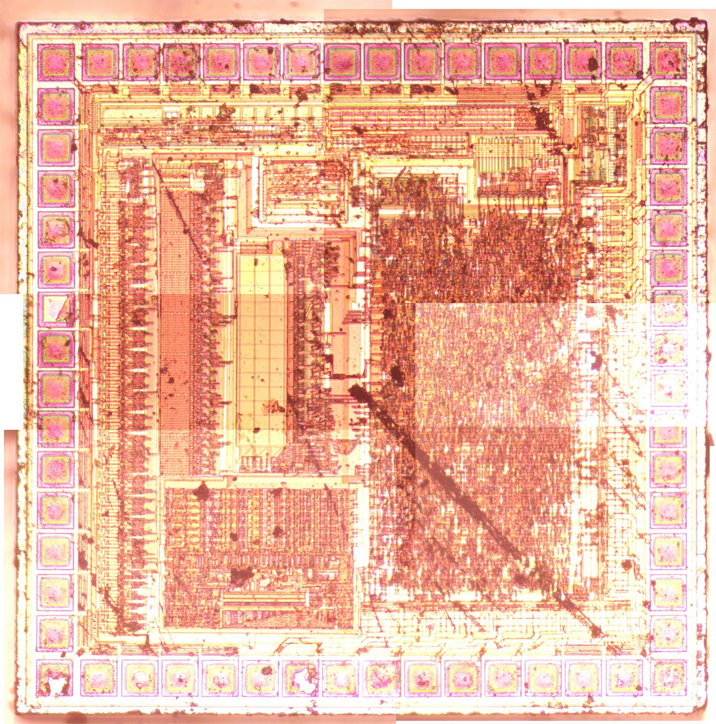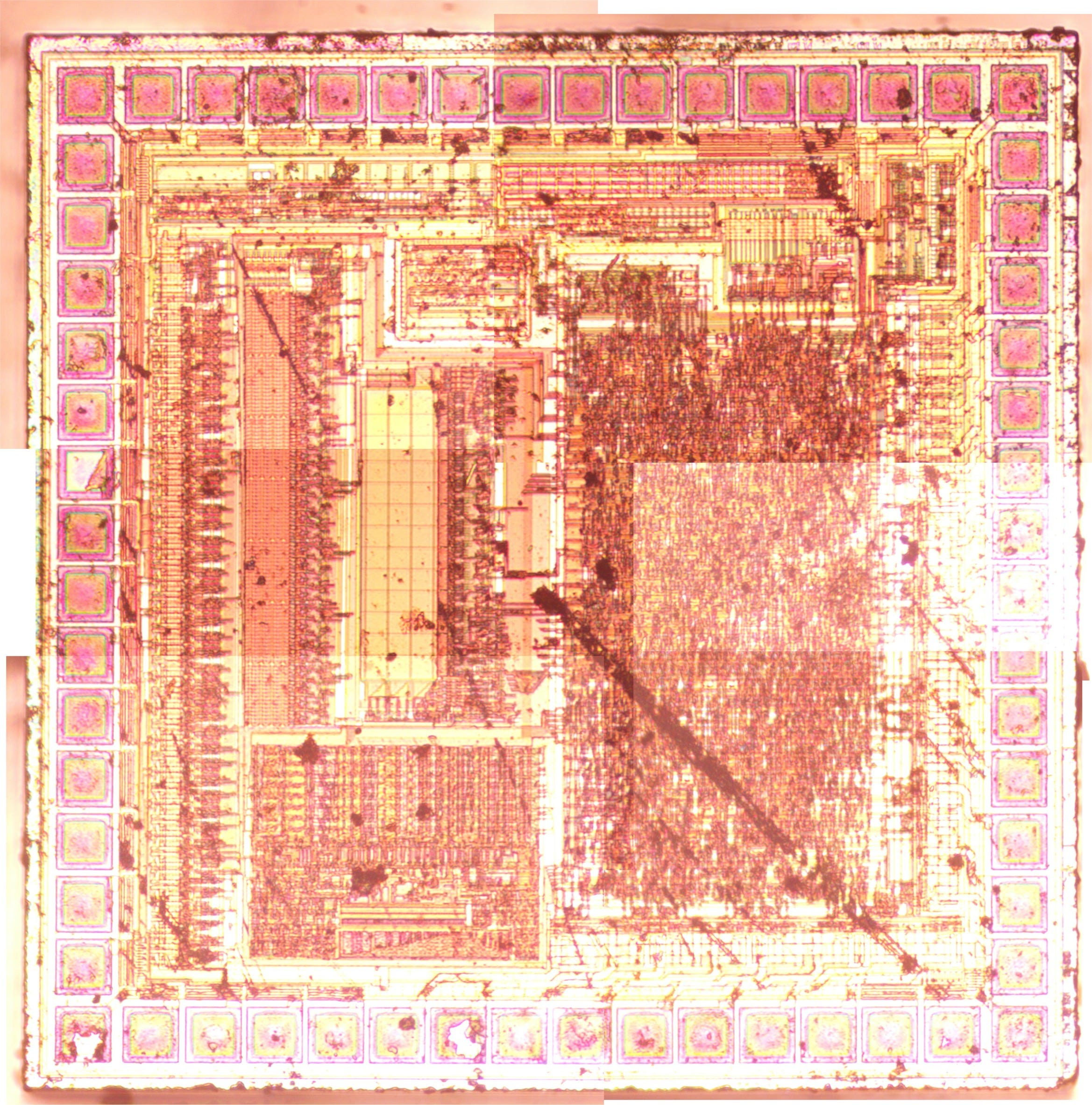I’ve been wanting to practice IC decapping and imaging. So I grabbed a $1 calculator, pulled it apart and stuck the die in acid. This resulted in the following die image, stuck using manually stitched frames (and the hacked together epi-illumination setup I’ve discussed before).